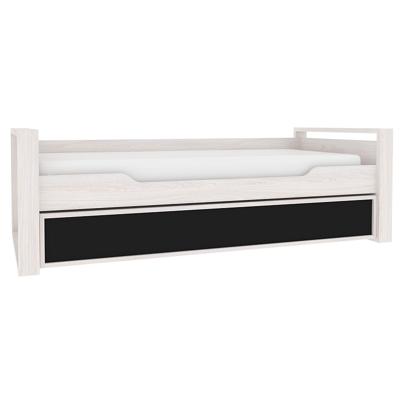 Детская или подростковая кровать-тахта с большим ящиком глубиной 182 мм на выкатных роликах. Его можно использовать как место для хранения постельного белья или как дополнительное спальное место для незапланированных гостей. Для полноценного спального места достаточно убрать разделитель и положить матрас. Размер матраса для основного спального места 190х90 см. Размер матраса для дополнительного спального места: 190х80 см, высотой до 18 см. Дополнительные боковые ниши в кровати помогут подростку держать под рукой необходимые перед сном вещи. Бонусом для современных детей станет компактная встроенная в кровать зарядка для телефонов и планшетов.