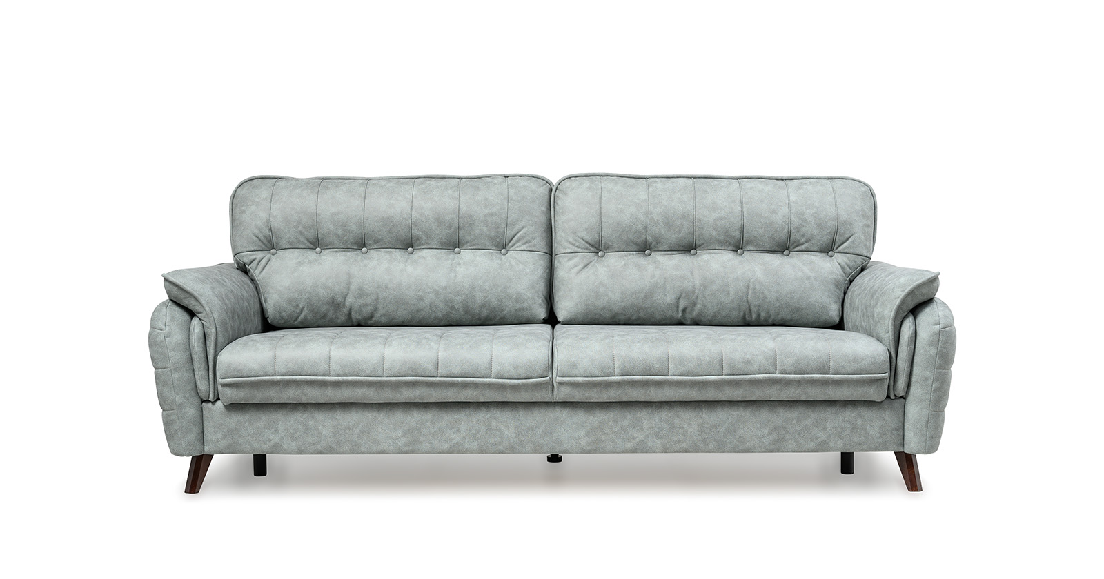 Декоративные канты на подушках дивана, подлокотниках и сиденье. Стежка на передней части сиденья и внешней части подлокотника. Защипы на верхней части подушки. Втяжки с пуговицами на приспинных подушках.