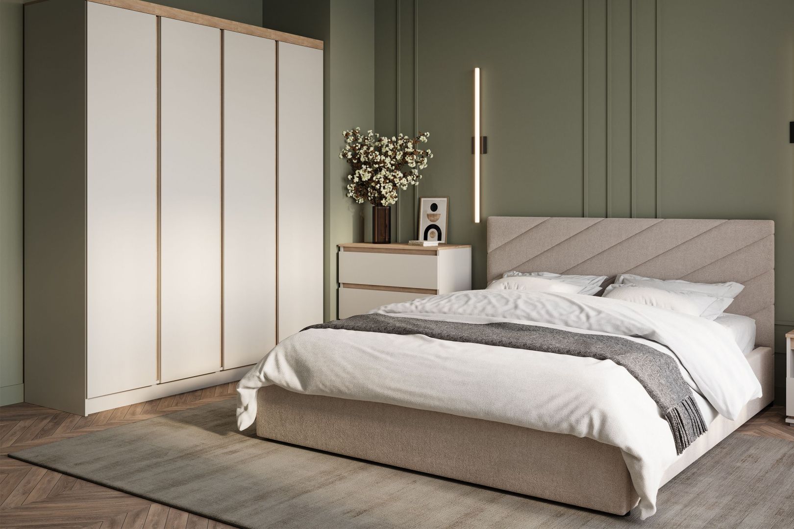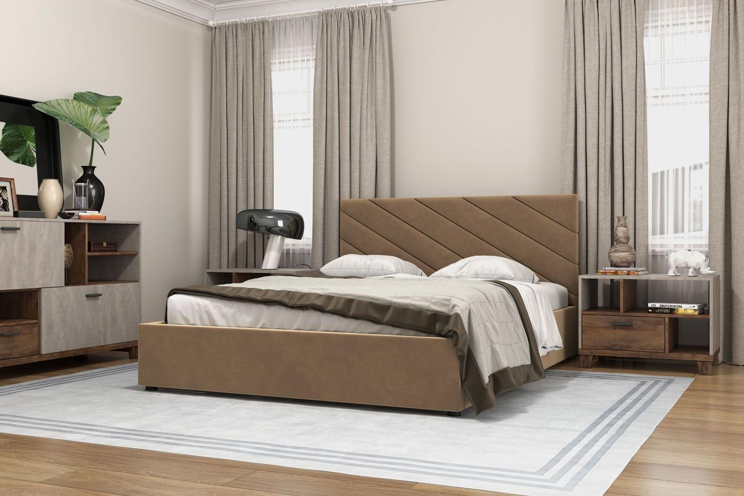 Кровать с мягким изголовьем Юта украшена стёжкографией в виде геометрического узора на спинке и изножье. Отделка придает декору строгости и лаконичности, а мягкая обивка - комфорта и роскоши. Интерьерная кровать Юта комплектуется металлокаркасом и дополнительно может быть оснащена подъемным механизмом с газовым амортизатором (газлифтом). Двуспальные мягкие кровати БРАВОмебель имеют надежный каркас из МДФ, фанеры и ЛДСП. В качестве наполнителя используются различные материалы, такие как холкон, поролон и периотек, которые обеспечивают мягкость, комфорт и долговечность изделия. Внешний слой обивки кровати выполнен из износостойкой качественной ткани.