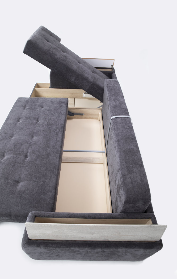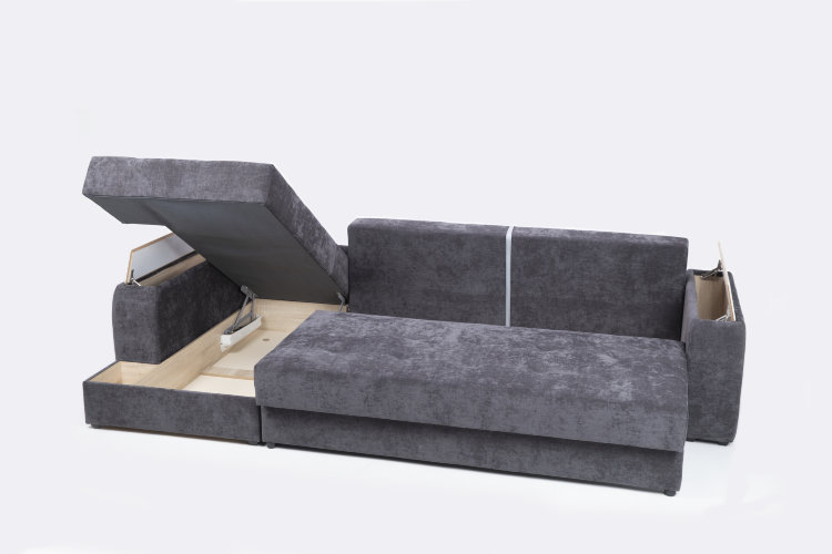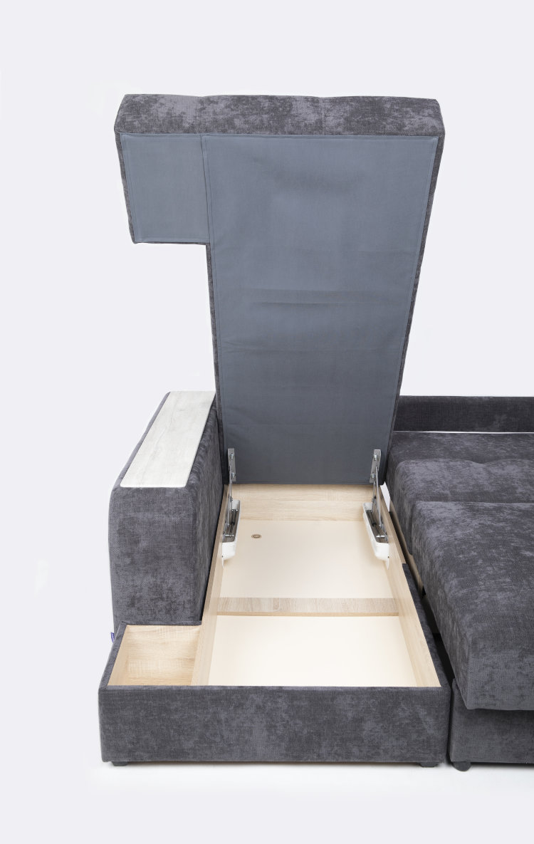 Вы легко сможете разложить диван с помощью механизма «тик-так» со стальными направляющими AURORA STEEL. А с ортопедическим наполнением AURORA FORM ваш сон на диване будет здоровым и крепким. Ниши для хранения расположены под посадочным местом и в подлокотниках.